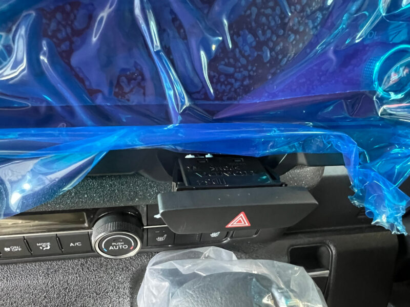 グローブボックス裏から手をいれば、裏からハザードランプを外します。